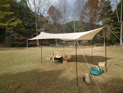 キャンプ場についたらまずは雨よけ用のタープを建てるそうなのですが、その時間帯は風が強く、支柱となるポールを建て紐を張ってからピックで固定するときに風に煽られてポールが倒れたり、袋が飛んで行ったりとトラブルだらけでした。