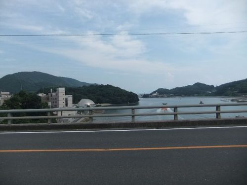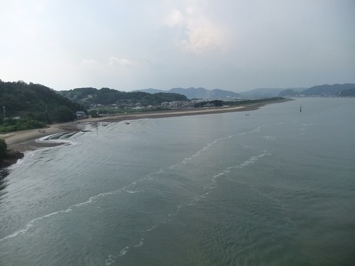 橋の反対側です。銀色の建物が見えますが、あれはカブトガニ博物館です。