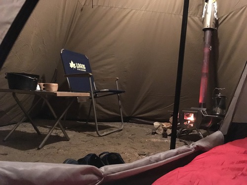 フロアレスタイプのテントの中にテントのインナーを入れ、さらにストーブを設置!
